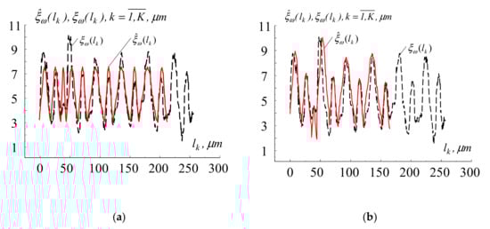 The result of modeling the surface microrelief of titanium alloy Ti6Al4V after processing with femtosecond pulses: (a) based on the well-known mathematical model [14]; (b) based on the proposed mathematical model (red line—experimental data; black line—results of modeling).