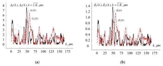 Fragments of the absolute and relative errors of computer modeling of the surface microrelief of titanium alloy Ti6Al4V after processing with femtosecond pulses: (a) absolute errors, (b) relative errors.
