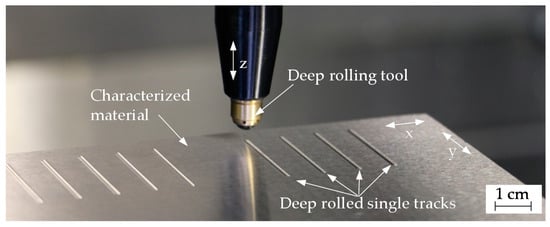 Thereby, e.g., strain hardening effects could be quantified by deep rolled single tracks at non-functional surfaces. The possibility of deep rolling to vary the strain rate within a certain range further allows statements about the deformation behavior beyond the quasi-static hardness measurement. Using a mechanically mounted deep rolling tool, the information about the penetration depth could directly be revealed regarding the displacement of the tool.