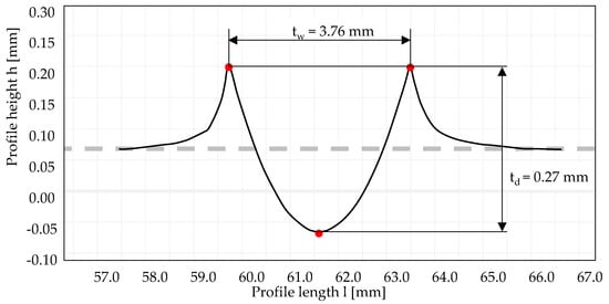The track geometry was determined utilizing the stationary tactile surface measuring device Surftest SV3200 (Mitutoyo Deutschland GmbH, Neuss, Germany). It enables the measurement of heights up to 500 µm (force 4 mN). The probe tip had a radius of 2 µm and a tip angle of 60°. Determined track geometries were post processed in the software FORMTRACEPAK version 5.523 of Mitutoyo. Figure 2 exemplarily shows a track profile resulting after deep rolling 100Cr6 SA with a pressure of 400 bar and a tool with a diameter of 13 mm (number of rollovers n = 30). As indicated, the variables track width tw and track td depth were determined within the software.