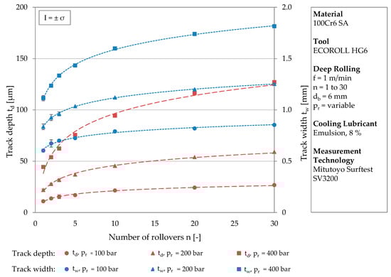The examination of the track depth td and the track width tw in regard to the input parameters shows an expectable deepening and widening of the track with increasing deep rolling pressure pr and number of rollovers n. For high numbers of rollovers, the track characterizing values tend to converge towards a deep rolling pressure-dependent threshold value. This is in good agreement with the observations of Hettig and Meyer, who attributed the reduced increase in plastic deformation with an increasing number of contacts to the changing contact area []. If no more changes in the track geometry are determined, it can be assumed that there is a balance between the material properties and the deep rolling force which influences the surface [].