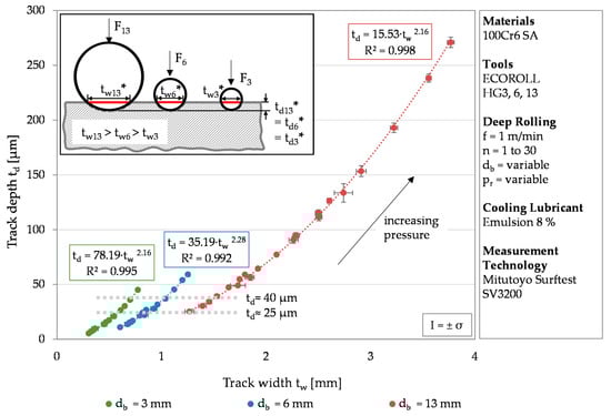 While Figure 3 the results for one tool diameter, Figure 4 visualizes the track depth over the track width for varying tool diameters. The different tool diameters are color coded. Green represents the results determined after deep rolling using a tool diameter of db = 3 mm, blue using a tool diameter db = 6 mm, and red using a tool diameter of db = 13 mm. The values were subjected to potency regressions, which all had a coefficient of determination of at least R² = 0.992.