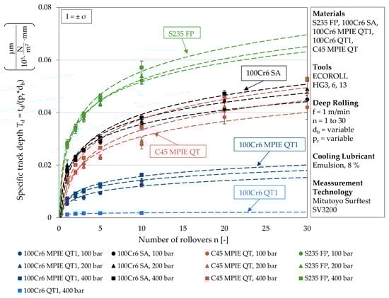 In order to evaluate the track depth in relation to the applied load and the tool size, the specific track depth Td is introduced. It is determined by dividing the track depth by the deep rolling pressure and the tool diameter. Physically, the specific track depth corresponds to a change in area per applied deep rolling force. In this case, the area is the cross-section of the track, which is also represented by the measurement of the track geometry. For the materials investigated within this work, the specific track depth is plotted against the remaining deep rolling parameter n (number of rollovers) in Figure 5. Different material states are separated by different colors to illustrate differences in plastic deformation behavior. The different icons again represent a certain deep rolling pressure, and the values of each deep rolling pressure were subjected to a logarithmic regression. Although the specific track depths do not yield exactly one characteristic curve for each material, the trend curves of one material converge and form a range within which all results are located. As visualized by the different colors, this range varies according to the composition and heat treatment of the respective material.