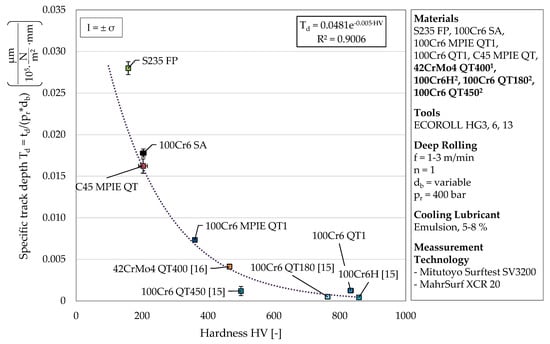 Since the material-dependent range is defined by lines of different deep rolling pressure, values were compared for a constant deep rolling pressure of 400 bar and a number of rollovers of n = 1. Figure 6 the determined specific track depths in dependence of the corresponding material hardness. Similarly to Figure 5 and as expected, a decreasing plastic deformation is observable for increasing hardness values. The material states additionally presented appear at high hardness values between 100Cr6 MPIE QT1 and 100Cr6 QT1.