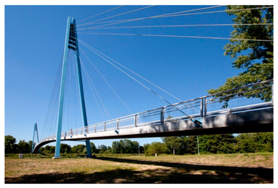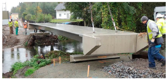 Current application of concretes of the highest grade in civil engineering is still relatively rare, with few successful applications as bridge decks, industrial floors, building facades (for example, Museum of Civilizations of Europe and the Mediterranean), wind turbine towers or prefabricated prestressed girders [4,6,7]. Other interesting applications of ultra-high performance concrete are lightweight shell structures (especially roof construction—for instance, the light rail roof platforms in Calgary) and permanent formwork (the advantage is the acceleration of the technological process of building construction). Use of UHPC for prefabricated prestressed girders of long-span bridges or footbridges (Figure 1 and Figure 2 show the applications in the Czech Republic) seem to be very promising since the material has high resistance against the environment (de-icing salts, SO2, and freezing resistance) and is a light-weight material [8,9]. Upgrades are a brand new field for the application of UHPC. High strengths of ultra-high performance concrete are particularly advantageous for seismic upgrading of existing structures [6,9].