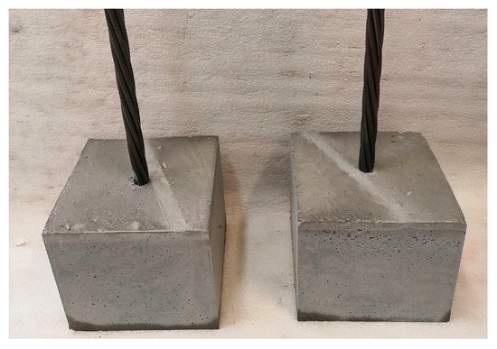 UHPC samples (cubes with an edge length of 150 mm—the same cube samples were performed for compressive strength measurements) for bond strength tests were fabricated according to the standards [26,27], including anchoring of prestressing reinforcement in the axis. Storage does not require the separation (PVC tube) of the prestressing reinforcement from the UHPC matrix [26,27]. Correct anchoring placement was achieved by using a trapezoid wooden insert on the bottom of the mold and squared timber on the top (Figure 4).