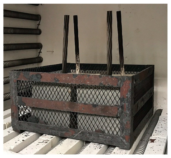 Example of the UHPC samples with prestressing reinforcement in the furnace.