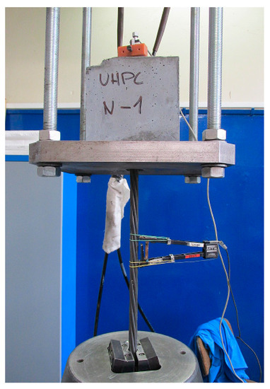 The testing of the prestressing reinforcement with UHPC was done by recording the increasing bond stress slip on the unloaded end of the reinforcement (loading machine MTS 500 kN by using MTS FlexTest, Eden Prairie, MN, USA). The test was controlled by the displacement of the unloaded end of the reinforcement (a stable loading rate of 0.005 mm·s−1)—see the pull-out test experimental setup in Figure 7 (reprinted and remarked from [26,27]). The loading was terminated after reaching a slip of 2.0 mm. The experiment setup before the test is shown in Figure 8.