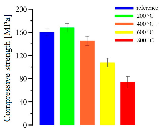 The results of measurement of UHPC specimens are shown in Figure 9. The average value of compressive strength (10 measurements for one group of samples) for a reference sample (exposure at 20 °C) is depicted by the blue bar and for the samples exposed at 800 °C by the red bar. At 200 °C (green bar), a minor increase of compressive strength for the UHPC samples was detected (approximately 10%), which is in accordance with the previously published results for an UHPC of similar composition [30,31,32]. The decrease of bond strength of UHPC samples with increasing temperature can be explained by changes in composition (dehydration and, at high temperatures, decomposition of hydration phases) and microstructural changes (porosity increase, cracks on the phase interfacial transition zone of aggregate/matrix and/or fiber/matrix) [9,11,14]. The increase of compressive strength in the samples exposed at 200 °C is caused by the promotion of cement hydration process and pozzolanic reaction, resulting in a denser microstructure [14,33]. The reactivity level of silica fume can be increased from 10% to 75% by growing the temperature from 90°C to 250 °C [14,34]. Some research works describe an increase of compressive strength in UHPC samples up to an exposure temperature of 300 °C. Furthermore, the temperature of 300 °C is considered as the limit for the positive effect of the reactivity level of silica fume. A declining trend in mechanical properties of UHPC exposed beyond 300 °C was mainly due to the weakening of the internal microstructure [18,35]. The change of compressive strength in the temperature range 200–300 °C very closely depends on the type of added fibers; for the specimens with polypropylene fibers, a steep decline of compressive strength can be observed due to melting of the fibers (formation of a specific porous structure). In contrast, the addition of steel fibers slightly increases the compressive strength above 200 °C by about 1–5% [36,37].