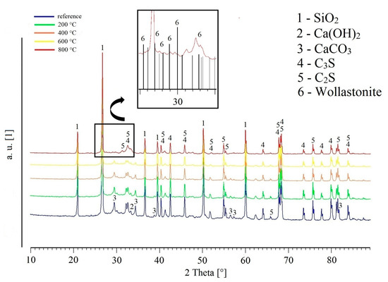 Figure 11 shows the XRD patterns of UHPC powdered samples. The reduction of peak intensity characterizes the content of Ca (OH)2 (CH-portlandite) during exposure to 200 °C (confirmation of the silica fume pozzolanic reaction rate [3,7]). The Ca (OH)2 peak disappears completely after the exposure of UHPC to 600 °C, in agreement with other research works focusing on the decomposition of portlandite (CH) at temperatures above 600 °C [14,48,49]. CaCO3 (calcite) peaks are not evidently present for specimens exposed to 800 °C (the decomposition of calcite occurs at approximately 700 °C [50,51]). The decomposition of Ca (OH)2 and CaCO3 can be partially related to the decrease of mechanical properties (compressive strength and bond strength) [14]. More significant is the effect of dehydration and partial transformation of C-S-H gel (~700 to 800 °C) [52,53]. It has been shown that above 800 °C, the amorphous C-S-H gel transforms into crystalline wollastonite [54,55]. This change is also related to the decrease of the UHPC mechanical properties. The presence of wollastonite mineral (an amount of about 1–5 wt.%) was detected by XRD (see details in Figure 10). A more accurate analysis of the wollastonite content is prevented by the SiO2, C3S and C2S phase overlap especially in diffraction angle area 25–35°. In some research works it is considered that the faster transformation of the C-S-H gel to wollastonite occurs only at a temperature of 900 °C, when this transformation already has a fundamental effect on the development of the pore structure and thus on the compressive strength of UHPC [36,37].