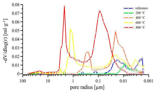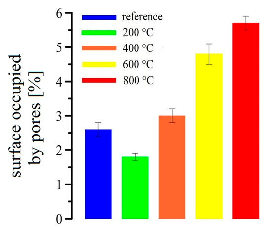 At 600 °C, a significant increase of the pore area (almost 2%) was detected. The results are compared to the samples exposed to 400 °C. The difference between the samples exposed to 600 °C and 800 °C is not that significant (~1%). It is apparent that at 600 °C, pores of different diameters occur (amplifying degradation processes in UHPC). At 800 °C, large cracks appear on the surface of UHPC samples, which render the precise total pore area measurement impossible. It is expected that the analysis somewhat underestimates the total pore area for the samples exposed to 800 °C.