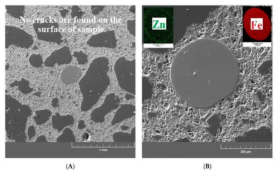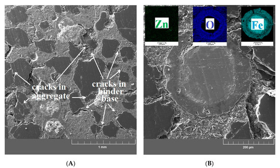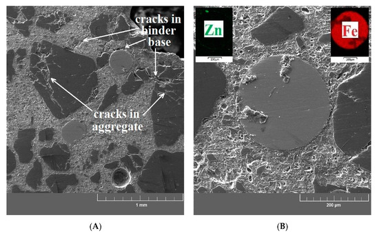 After high-temperature exposure, integrity (morphology) was studied using scanning electron microscopy. Both the matrix of the UHPC samples and the phase interfacial transition zone between the matrix/brass-coated steel fibers and the matrix/aggregate were studied. Cross sections were prepared from the sites with high aggregate concentrations near the brass-coated fibers. The degradation degree of the coating (brass) and the surface of the steel fibers (partially melt) was verified using elemental maps (Fe and Zn, eventually O).