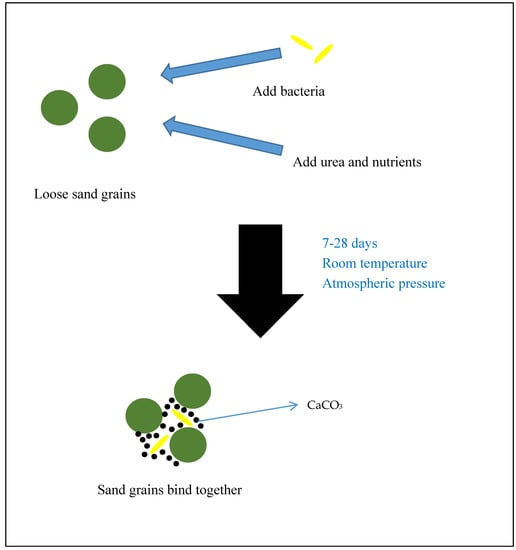 Microbially induced calcium carbonate precipitation (MICP) is a process that occurs when microorganisms, especially bacteria, are provided with appropriate substrates and thus induce the formation of calcium carbonate (CaCO3) crystals. The CaCO3 formed is very useful in coating surfaces and binding different particles together [1,2,3]. MICP can occur under atmospheric pressure and other mild conditions. In fact, it happens in nature all around the world. This process has coated the surfaces of various natural structures and left hints about past ages for researchers to discover. Formation of CaCO3 by microorganisms has been studied through biomimetic approach and then applied in various fields such as construction, environment, geo-techniques, and nanotechnology [4,5]. An example of the MICP process is shown in Figure 1.