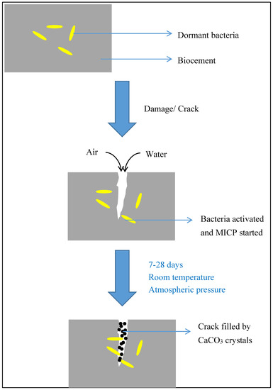 Construction costs are rising over the years and are expected to stay high for future times ahead. Producing building materials that are more durable and longer lasting can help to reduce maintenance costs. MICP was reported by various researchers to enhance strength and durability of building materials. Development of self-healing building materials also helps to reduce resources spent on routine repairs [9,10]. By including appropriate bacteria into cement or concrete, the formation of cracks will be stopped and sealed by the bacteria due to CaCO3 precipitation. Figure 2 shows the schematic diagram of self-healing process. Bacterial solution can also be applied from outside to seal a cracked surface on old building materials.