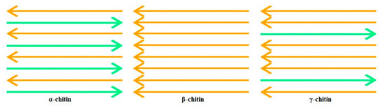 There are two main polymeric forms in which chitin exists—α-chitin and β-chitin, which are respectively arranged according to the monoclinic and orthorhombic cells. Compared to α-chitin, β-chitin, which can be extracted from squid pens, shows higher solubility, reactivity, and swelling, but α-chitin is preferably used in research laboratories and industries due to its greater dissemination in biomass, especially as an essential component of crustacean shells [21,22]. There is also a third form of allomorph, γ-chitin, which resembles a combination of α and β forms, instead of a different allomorph. When comparing the β and γ forms, the structure of α-chitin was further investigated, since it is the most common polymorphic form. As shown in Figure 1, α-chitin has a compacted orthorhombic cell, composed of alternating leaves of parallel and antiparallel chains; in β-chitin the adjacent leaves on the c-axis extension have the same direction; and γ-chitin, in turn, presents an alternating arrangement of polymer chains, where each third leaf has the contrary direction to the antecedent two leaves [13,23,24].