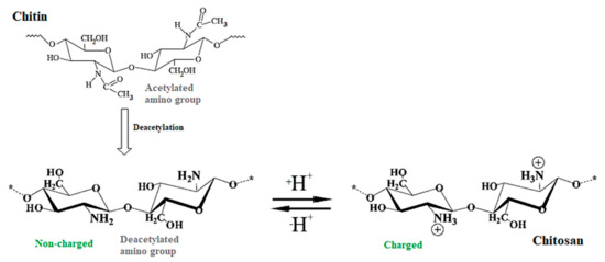 Chitin possesses a linear chain of acetylglucosamine groups. The removal of enough acetyl groups through the deacetylation process gives rise to chitosan, which has a high concentration of reactive amino groups (−NH2) and presents solubility in most dilute acid solutions. This process occurs by enzymatic hydrolysis in the company of specific enzymes or chemical hydrolysis under drastic alkaline conditions [2,25]. Figure 2 illustrates the chemical structures of chitin and chitosan.