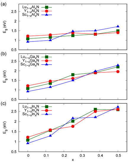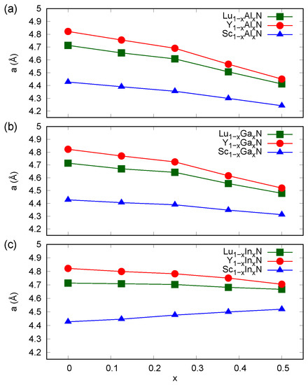 Regarding the band gaps of the solid solutions considered here, as depicted in Figure 2, their dependences on a composition are also of a linear type. This finding comes from experimental studies of certain wurtzite and rock salt RE-based materials [8,9,10,11,12,13,14] and is opposite to a tendency of formation of strong band gap bowings, characteristic for group III nitrides [29]. The band gaps of rock salt group III nitrides of 6.33, 2.83, and 1.48 eV, calculated here for AlN, GaN, and InN, respectively, are bigger than those of the REN host materials. One may therefore expect relatively increased band gaps in the solid solutions. Interestingly, the increase in as a function of a composition is clearly connected with the ionic radius of the particular group III ion. A relatively small change in was revealed for the AlN, whereas the corresponding effect in the InN alloys is very strong. This phenomenon is connected with a strong influence of the tensile strain on in REN systems, discussed in [6]. The REN materials with decreased volumes of unit cell are expected to exhibit smaller . The presence of Al ions, in which the d-type electronic shells are unoccupied, is equivalent to chemical pressure in the neighboring region of a material. In turn, the In ions are heavier and exhibit fully occupied d-type bands, and affect the electronic structure of a particular system to a greater extent.