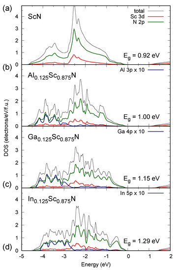 As presented for Sc-based systems in the density of states (DOS) plots in Figure 3, the electronic structure of the valence regions of the materials studied in this work are dominated by the contributions coming from nitrogen ions, which is a characteristic feature of nitrides in general. The valence band maximum (VBM) is also formed by the d-type states of RE ions. It is worth noting that the p-type and s-type (not shown in Figure 3) bands of group III ions are located well below VBM, i.e., in the energy region below −2.5 eV. As depicted for AlScN in Figure 4, these bands are also pronounced in a band structure. Their shapes are relatively flat, which results in gap regions in some directions in the Brillouin zone (the W – L, L – – X, and X–W–K lines). Furthermore, the overall shapes of DOS of the systems, depicted in Figure 3, are very similar to each other. The presence of Al/Ga/In dopant ions does not affect VBM of the ScN host material, which is an opposite effect to one reported for group III nitride alloys [29]. This feature is common for all materials considered in this study. The findings presented here are consistent with the above discussion of possible strain effects on the electronic structure of mixed RE and group III nitrides. They seem to be a main origin of an increase in as a function of the composition of particular systems.