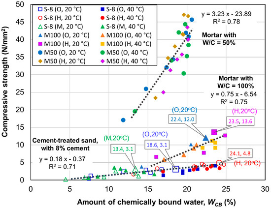 - The higher compressive strength of the HPC-treated sand can be explained by the higher quantity of chemically bound water (24.1% at 91 days) owing to the higher alite content, higher water-to-cement ratio, and higher porosity of the specimens compared with those (13.4% and 18.6% at 91 days) of the OPC- and MPC-treated sand.