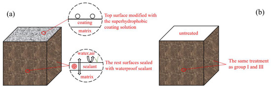 Upon compaction, the samples were cured at a room temperature of 20 ± 5 °C and relative humidity of more than 95%. Then, the specimens were demolded 24 h later as the modification was completed. The waterproof sealant was used to ensure that the top surfaces of the cube specimens were the only area in contact with the curing environment and at which moisture ion transport occurs (see Figure 1). Several parameters were tested to observe the effect of the coating on the specimens under different curing conditions.