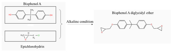 Epoxy resin is well-known for its applications in coating, adhesives, aerospace, and the electronics industry because of its outstanding physicochemical properties [32]. DGEBA provided by RESIPLAS PROTECT (Antwerp, Belgium) and XIAMEN ANYUE (Xiamen, China) was used in this study. It was obtained through condensation of bisphenol A and epichlorohydrin under alkaline conditions. The DGBPA used in this study was opaque white pasty fluid, which turned to a whitish-gray solid after curing. The epoxy equivalent weight (EEW) and the epoxy value of the DGBPA were 210–280 g/mol and 0.357–0.476 mol/100 g, respectively, and it showed a melting point of 205–272 °C and viscosity of 5000–10,000 mPa·s.