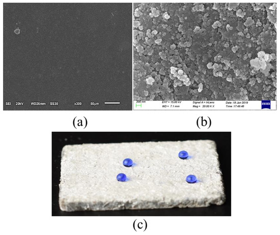 (a) DGEBA layer on cement sample’s surface; (b) FESEM images of superhydrophobic particles on DGEBA; (c) SiO2 aerosol @ DGEBA coating.
