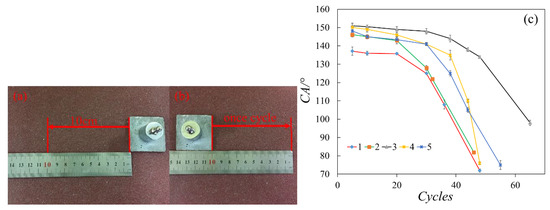 Figure 9c showed that the WCA value did not decrease significantly after 20 cycles. Besides, no obvious damage on the coating surface was observed with only a small amount of powder worn off from the specimens. While Group 3 and 4 hold a WCA higher than 148°, the WCA of Group 1 decreased rapidly after 24 cycles, and the WCA in Group 2 reduced after 32 cycles. The WCA in Groups 4 and 5 sustained more than 38 cycles while Group 3 maintained a high WCA even after 50 moving cycles.