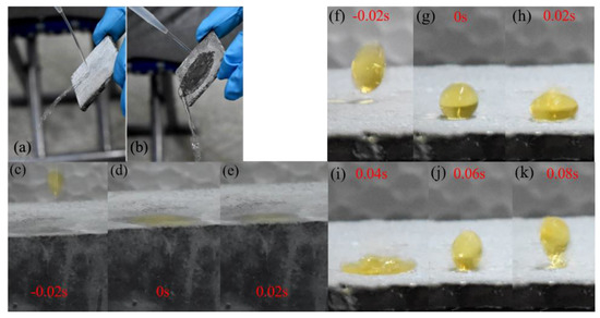 The previous study demonstrated that the water column bounces but does not wet or spread on the water-repellent surface [35], as shown in Figure 10a,b. In Figure 10c–k, we compared the water-affecting patterns between untreated and treated cement samples. Figure 10c–e illustrated that the water dropping process on the untreated cement samples surface readily wetted at the moment water droplets contacted the sample surface. The water droplet bounced off the treated surface without wetting, indicating the superhydrophobicity of the surface. The sizes of the droplets varied with random impact velocities.