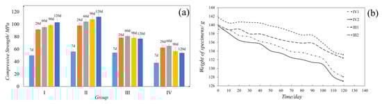 The coating material functions as a protective layer that enables the cement-based rehabilitation material to resist the negative effects of the corrosive environment. Samples were prepared and tested according to the design in Table 2. The 28d compressive strengths of the group I–IV cement samples were 91.6, 98.0, 81.6, and 62.4 MPa, respectively (Figure 11a). The average compressive strength of group III was 30.6% higher than that of group IV, while the average of group I was about 92% of that of group II.