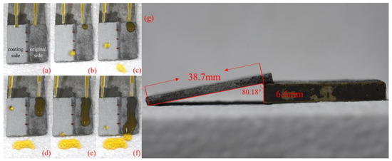 (a–f) The superhydrophobic surface holds a better drainage capacity compared to the untreated surface, (g) The side view of the half-coating specimen with a title angle of 9.82°.