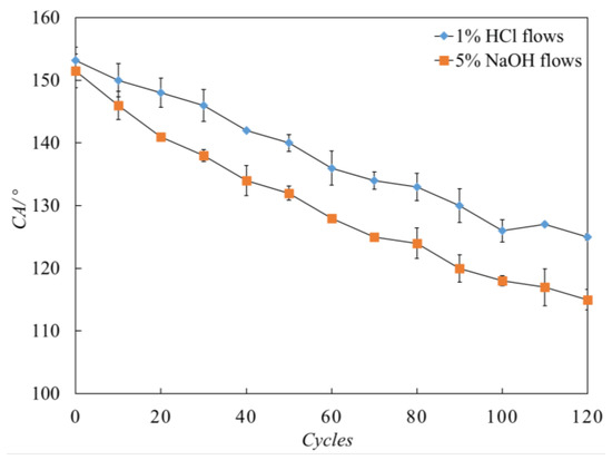 To test the corrosion resistance capacity of the coating under an acid/alkaline sewer environment, the corrosive liquid was repeatedly applied onto the surface for 5 s each time. The specimens were found to maintain their self-cleaning capacity when the liquid changed from water to acid and lye (see Figure 14). Very small decrease of the contact angle (CA) value was observed after the first 10 cycles, and the surface sustained a high CA after 120 cycles (Figure 14).