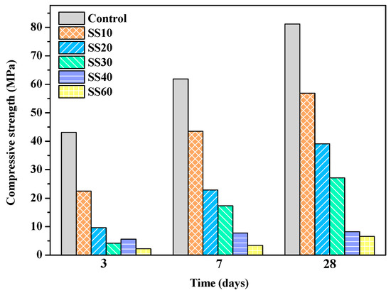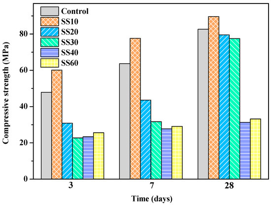 Compressive strengths of the control, SS10, SS20, SS30, SS40, and SS60 with air curing at 3 days, 7 days, and 28 days.
