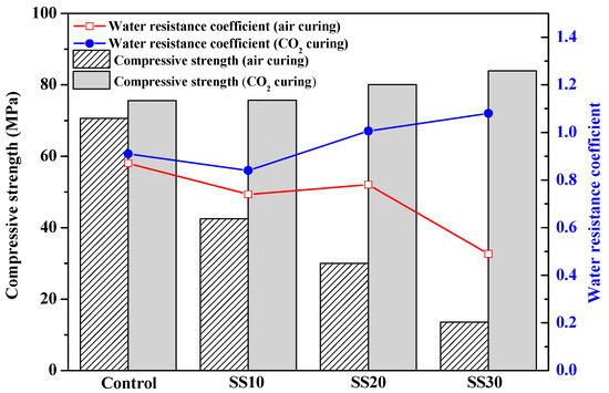Figure 4 shows the compressive strength and water-resistance coefficient of the samples after being immersed in water for 28 days. After being immersed in water for 28 days, the compressive strength of the control, SS10, SS20, and SS30 with air curing decreased from 81.2, 56.9, 39.1, and 27.1 MPa to 70.5, 42.5, 30.0, and 13.3 MPa, respectively. The water-resistance coefficient decreased with an increase in the steel-slag content. After the CO2 treatment, the water-resistance coefficient of the control, SS10, SS20, and SS30, reached 0.91, 0.81, 1.01, and 1.08, respectively, indicating that the CO2 treatment can improve the water resistance of the samples.