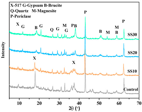 Figure 5 shows the diffraction pattern of the control, SS10, SS20, and SS30 at 28 days air curing. It also shows the most prominent peaks in the paste of the brucite, 517 phase, gypsum, magnesite, quartz, and periclase. An increase in the steel slag content decreased the formation of the 517 phase—one of the main reasons for the strength decline. Simultaneously, a reaction between the CaO in steel slag and the SO42- in the slurry resulted in the formation of the gypsum phase.