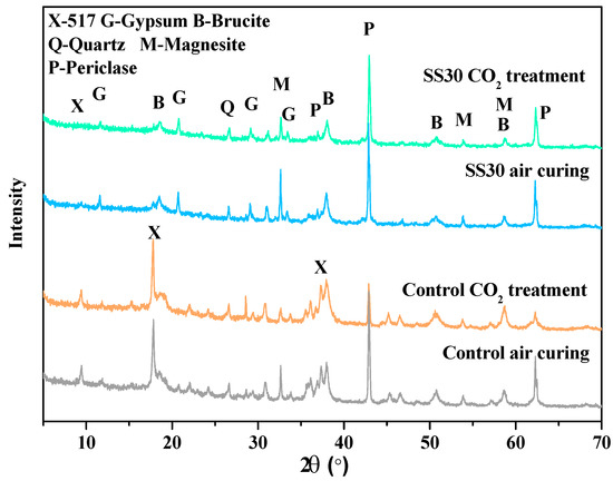 Figure 6 shows the diffraction pattern of the control, SS10, SS20, and SS30 with CO2 treatment at 28 days. Compared with the samples without CO2 treatment, the content of Mg(OH)2 in the control recorded an increase because carbonation accelerated the hydration of C2S [33], MOS cement, and MgO. The hydration of MgO can lead to expansion cracking, thus reducing the strength of the control. After the addition of steel slag, the peak of Mg(OH)2 is weaker than the samples without the CO2 treatment, which indicates that the CO2 treatment can reduce the content of Mg(OH)2.