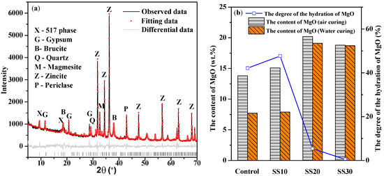 Table 4 shows the results of the Rietveld quantitative phase analysis of the control, SS10, SS20, and SS30 with CO2 treatment before and after immersed in water for 28 days. Figure 8a shows the Rietveld analysis plots of SS10 with CO2 treatment after water immersion for 28 days. After water immersion for 28 days, the content of MgO in the control decreased by 42.1%, whereas it decreased in SS10, SS20, and SS30 by 47.7%, 5.4%, and 0.5%, respectively; in contrast, the content of Mg(OH)2 increased by 20.4%, 95.4%, 18.3%, and 11.5%, respectively (Figure 8b). This means that the formation of Mg(OH)2 and the hydration of MgO was inhibited by the steel slag and CO2 treatment when the content of the steel slag in the samples exceeded 20%. In addition, the content of the 517 phase of SS20 and SS30 increased after immersion due to a decrease in the pH of steel slag after carbonation [26]. The content of C2S and C4AF also decreased significantly after immersion, and the reason for an increase in the compressive strength could be the hydration of C2S that formed C–S–H.
