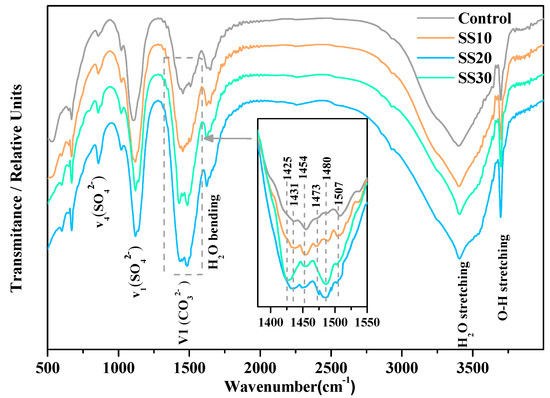 The FTIR spectra of the control, SS10, SS20, and SS30 with CO2 treatment for 28 days are shown in Figure 9. The peaks at ~890, ~1080, ~1425–1507, 1650, 3400, and 3700 cm−1 are due to a bend in the vibrations of CO32- [34], the stretching vibrations of SO42- [9], the asymmetric stretching vibration of CO32- [35], the vibration of H2O [13], the free O–H vibration of H2O [9], and the asymmetric stretching vibration of O–H [13]. It can be seen that with an increase in the steel slag content, the carbonate absorption band increased after carbonation. Previous studies have reported only a single absorption band between 1450 and 1480 cm−1 for magnesite; however, six absorption bands in the range of 1425–1507 cm−1 were found in this study, indicating six different carbonate ion environments [36], which meant a change in the structures of carbonate ion.