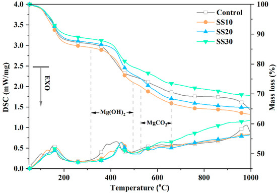 As can be seen, with an increase in the steel slag and CO2 treatment, the dehydration and decomposition of MOS became more complex. Two endothermic peaks were observed between 500 and 600 °C, indicating two forms of magnesium carbonate; the former is caused by nondecomposition of MgCO3 [37] and the latter by the MgCO3 crystal decomposition. Thus, it can be proven that new phases were formed in the MOS cement when mixed with steel slag and treated with CO2. As well, a significant weight loss in the control at 990 °C and no obvious weight loss after the steel slag addition indicate that the addition of steel slag changed the structure of sulfate.