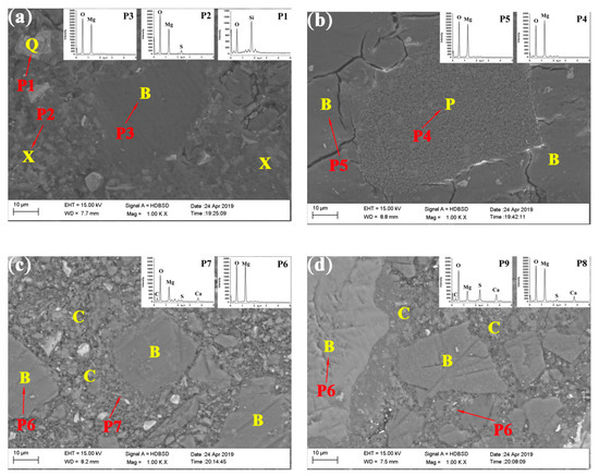 Backscattered electron image of the control and SS30 with CO2 treatment: (a) matrix of control after 28 days air curing; (b) matrix of control after 28 days water immersion after air curing for 28 days; (c) matrix of SS30 after 28 days air curing; (d) matrix of SS30 after 28 days water immersion after air curing for 28 days; X: 517 phase, B: Brucite, Q: Quartz, C: Ca–Mg–C amorphous substance; P: Periclase; P1 is Quartz; P2 is 517 phase; P3, P5, P6, and P8 are Brucite; P5 is Periclase; P7 and P8 are Ca–Mg–C amorphous substance).
