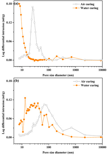 Comparison of cumulative intruded volume vs. pore diameter after 28 days of air curing and after water immersion for 28 days: (a) control and (b) SS30.