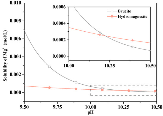 Relationship between the Mg2+ solubility and pH in brucite and hydromagnesite (the Ksp values of brucite and hydromagnesite are −11.16 and −38.47, respectively [40,41]).
