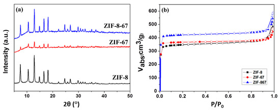 (a) XRD patterns of ZIF-8, ZIF-67, and ZIF-8-67 samples; (b) comparison of N2 adsorption/ desorption isotherms of ZIF-8, ZIF-67, and ZIF-8-67 samples.
