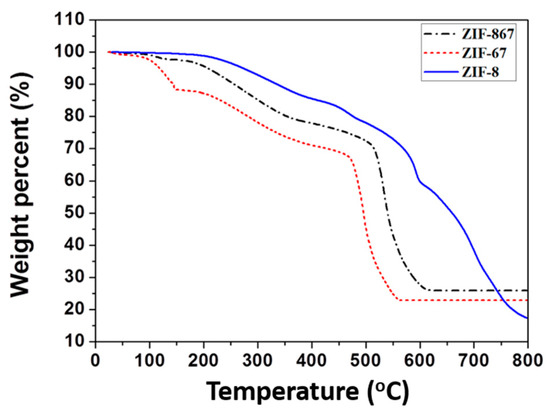 From the analysis of the SEM images, the ZIF-8 particles were found to have an average diameter of 119 ± 20 nm (Figure 2), and the ZIF-67 particles to have an average diameter of 98 ± 25 nm (Figure 2). The morphology of the ZIF-8 particles was a polyhedral shape. The ZIF-67 particles resembled the ZIF-8 grown in methanol for 1 h, with a ball shape but with non-uniform size distribution. Similarly, the material ZIF-8-67 displayed a polyhedral morphology. This result may be related to the strength of the crystals, which is consistent with the XRD pattern. Typical TGA curves for all three samples are shown in Figure 3, and they all display three weight-loss stages. The first weight-loss stage between room temperature and 200 °C occurs due to occluded solvent and water. The second weight-loss stage of ZIF-67 starts at 200 °C and decreases at 475 °C, whereas ZIF-8-67 and ZIF-8 start to decrease at higher temperatures, up to 520 and 575 °C, respectively. In the third weight-loss stage, the decomposition of organic linkers in the framework caused theatric weight loss. TGA analysis shows that ZIF-8-67 is not as stable as ZIF-8, but is more stable than ZIF-67.