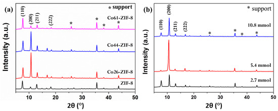 XRD patterns of ZIF-8-67 membrane: (a) with different Co content and (b) structural evolution of the Co44-ZIF-8 membrane with different SF concentrations (2.7, 5.4, and 10.8 mmol at 100 °C for 2 h).