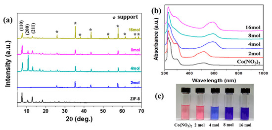 (a) XRD patterns for Co44-ZIF-8 membrane with different mIM concentrations: 2, 4, 8, and 16 mmol at 100 °C for 2 h, (b) UV–Vis spectra, and (c) color changes of synthetic solution.