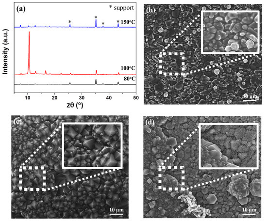 (a) XRD patterns and SEM images of Co44-ZIF-8 membrane prepared with different reaction temperatures: (b) 80, (c) 100, and (d) 150 °C.