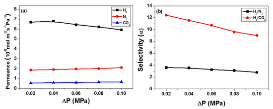 The permeation performances of the ZIF-8 and Co44-ZIF-8 membranes were measured using a gas permeation setup. For comparison, we controlled the membrane thickness and crystal orientation of both Co44-ZIF-8 and ZIF-8 membranes so they were identical, with no visible cracks, or other defects observed. Figure 9 shows the gas separation performance of the Co44-ZIF-8 hybrid membrane in terms of different transmembrane pressure drops, i.e., the volumetric flow rates of the single gases (H2, N2, and CO2) through the membrane at room temperature. The single-component gas permeance decreased with increased molecular weights in the order H2 > N2 > CO2. The dominance of gas permeance in diffusion control, but not the molecular sieve control, suggests that the Co44-ZIF-8 on the membrane surface has more interaction with CO2 than N2 [23,24], which has a significant influence on the permeability through the Co44-ZIF-8 membrane. This trend is more obvious in the lower pressure drop. Both CO2 and N2 permeance slightly increases with increasing the pressure drop, but H2 permeance decreases with the pressure drop. A further increase in the pressure drop of H2 could enhance the permeation flux, but the increase would not be sufficient to compensate for the higher pressure difference, resulting in decreased permeability. Figure 9b shows that the gas permeance selectivity (α) decreased in αH2/CO2 from 12.4 to 9.0, and in αH2/N2 from 3.6 to 2.8, with increasing feed gas pressure.