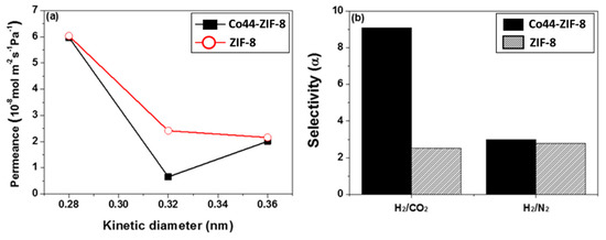 The single component permeability of the gas kinetic diameter test is illustrated in Figure 10. This ZIF-8 membrane has higher H2 and CO2 gas permeance but lower H2/CO2 selectivity than ZIF-8-67. Notably, our synthesis-oriented ZIF-8 selectivity is lower than in the previous reports, which also noted orientation [14,15]. This may be related to the diameter size and character of the α-Al2O3 disc support. In this study, a larger diameter (30 mm) α-Al2O3 disc was used, which would have a higher chance of producing more defects on the surface, making the membrane density lower. Furthermore, as our seeding ZIF-8 particle size (~100 nm) was larger than in the literature (< 50 nm), it is also possible that this caused poor stacking in the coating step. A comparison with both Co44-ZIF-8 and ZIF-8 membranes for gas selectivity can be found in Figure 10b. The membrane is composed of Co44-ZIF-8 with a H2/CO2 selectivity of nine, which remarkably exceeds the selectivity of the ZIF-8 membranes. The main reason would be the slightly larger pore volume of the Co44-ZIF-8 membrane (0.616 cm3 g−1) compared with the ZIF-8 membrane (0.485 cm3 g−1). The Co2+ ions incorporated into the ZIF structure are beneficial for the Co44-ZIF-8 on the membrane surface, and result in more CO2 being adsorbed and diffused into a pore channel.