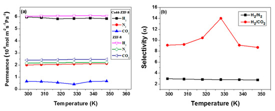 Previous works demonstrated that MOF membranes’ performance for gas separation might be significantly affected by the actual ambient temperature applied. Consequently, the ZIF-8 and Co44-ZIF-8 membranes was also investigated at different temperatures. Figure 11 shows that when the feed gas is a single component, the permeance values slightly decrease with the increase of the measured temperature. In contrast, CO2 shows a different behavior compared to the ZIF-8 membrane: a decrease in gas permeance when the temperature reaches 330 K, then an increase in gas permeance with further increasing temperature. As described by Zhao et al. [26], gas permeability is mainly dependent on temperature, and it can increase or decrease with increasing temperature, which depends entirely on the relative values of activation energy for diffusion, and exothermic adsorption. The probable cause for the CO2 behavior may be the change in the two related properties with the increase in temperature. For the above experimental results, this can be attributed to the Co44-ZIF-8 membrane that is conducive to enhancing the strong adsorption of CO2 molecules. However, a large quadrupole moment and polarizability facilitated the strong CO2 adsorption [27]. In addition, it must be considered that the rate of diffusion in the channels or pores of the membrane microstructure also has a significant influence on permeability [26,27]. In addition, the sucking behavior of CO2 induces the ideal selectivity to exhibit maximum value as a function of temperature, and this information is beneficial for getting the best-operating conditions for such a membrane. This can be explained by the Co2+ ions in the hybrid metal membrane interacting strongly with CO2, which influences the gas permeance and leads to better H2/CO2 selectivity.