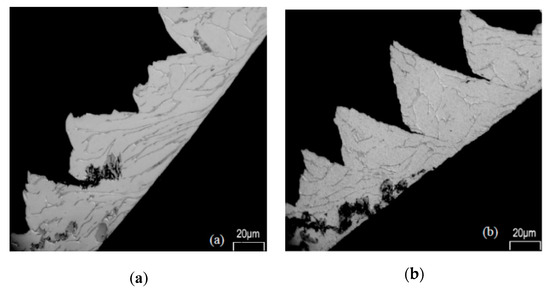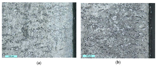 Changes in microstructure: (a) vs = 25 m/s, vw = 300 mm/s, ap = 0.3 mm; (b) vs = 20 m/s, vw = 300 mm/s, ap = 1.0 mm (vs = cutting speed, vw = speed of the workpiece, and ap = cutting depth) [62].